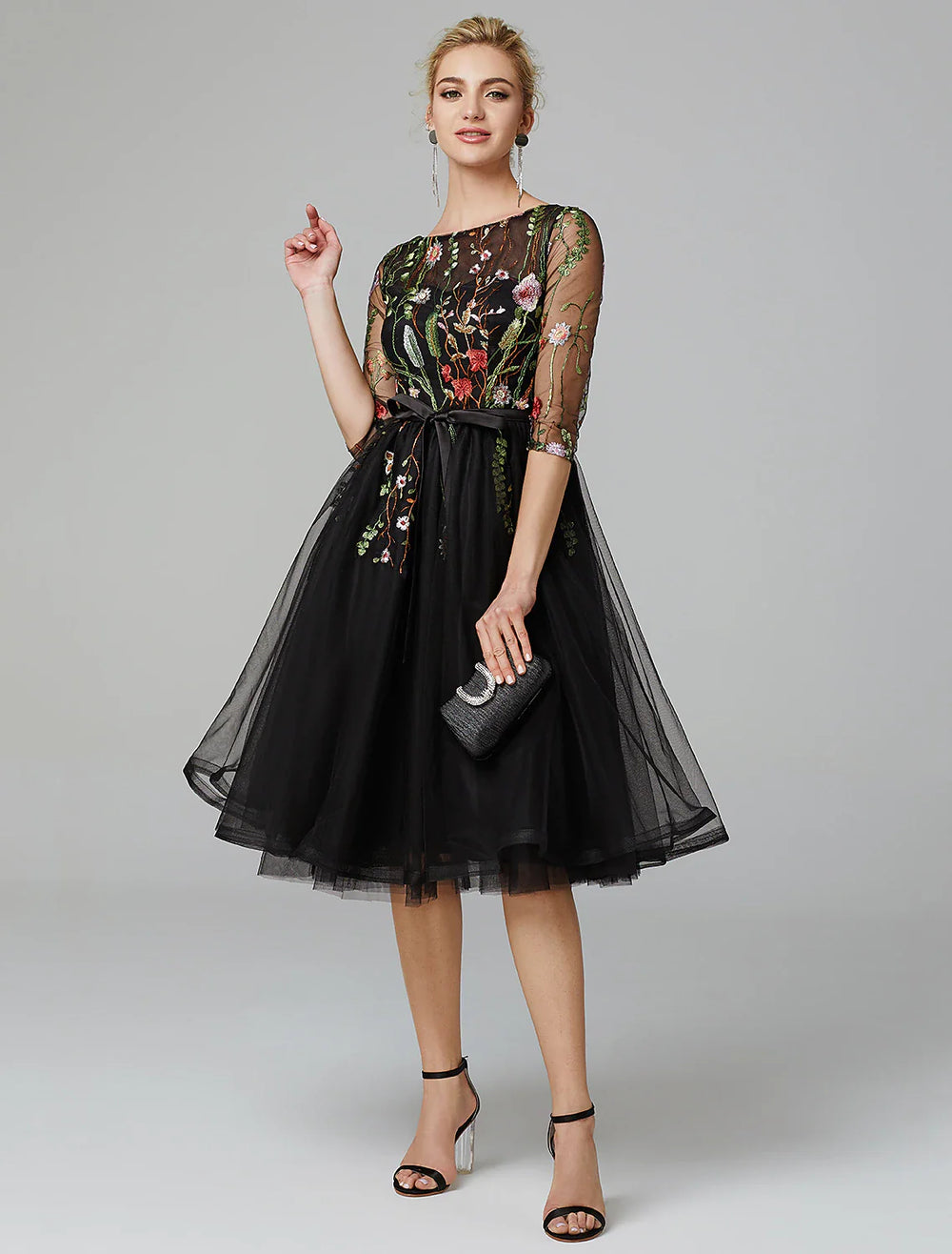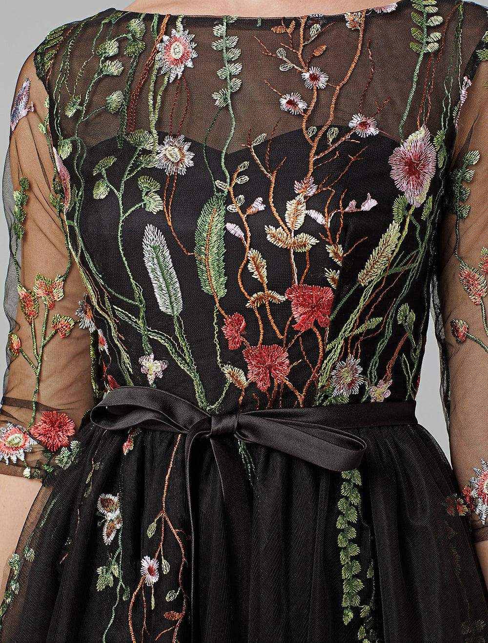A-Line Black Dress Vintage Wedding Guest Cocktail Party Knee Length Long Sleeve Illusion Neck Wednesday Addams Family Tulle with Embroidery Appliques