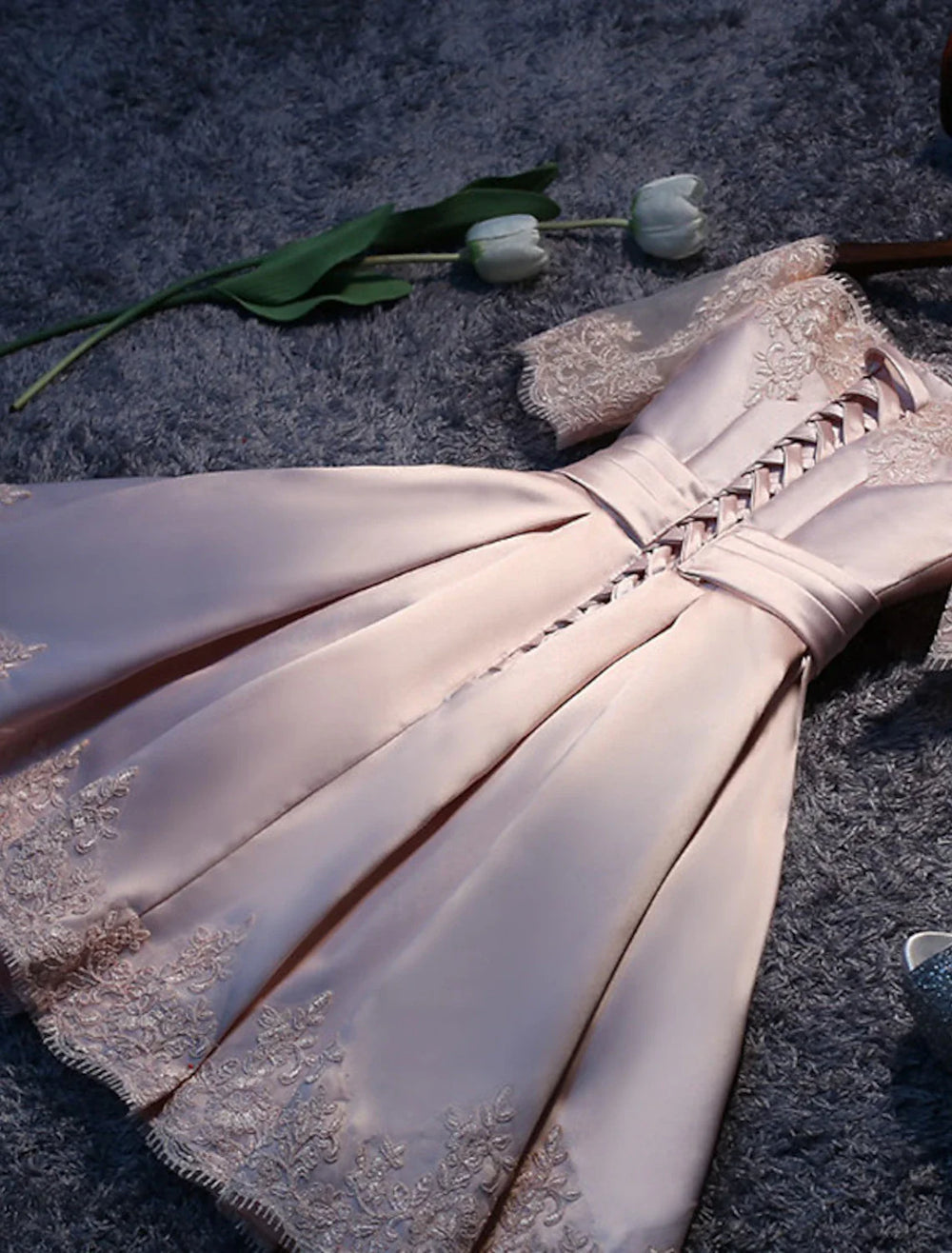 A-Line Bridesmaid Dress Off Shoulder Short Sleeve Elegant Short / Mini Satin with Lace