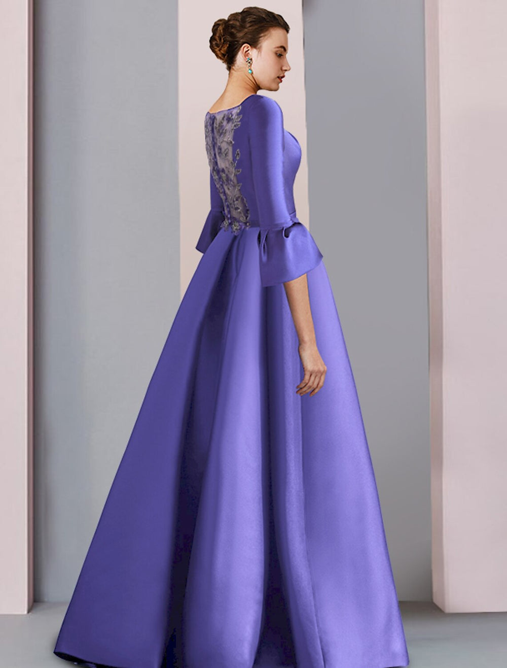 A-Line Mother of the Bride Dress Formal Party Elegant Scoop Neck Floor Length Satin 3/4 Length Sleeve with Bow(s) Pleats Embroidery