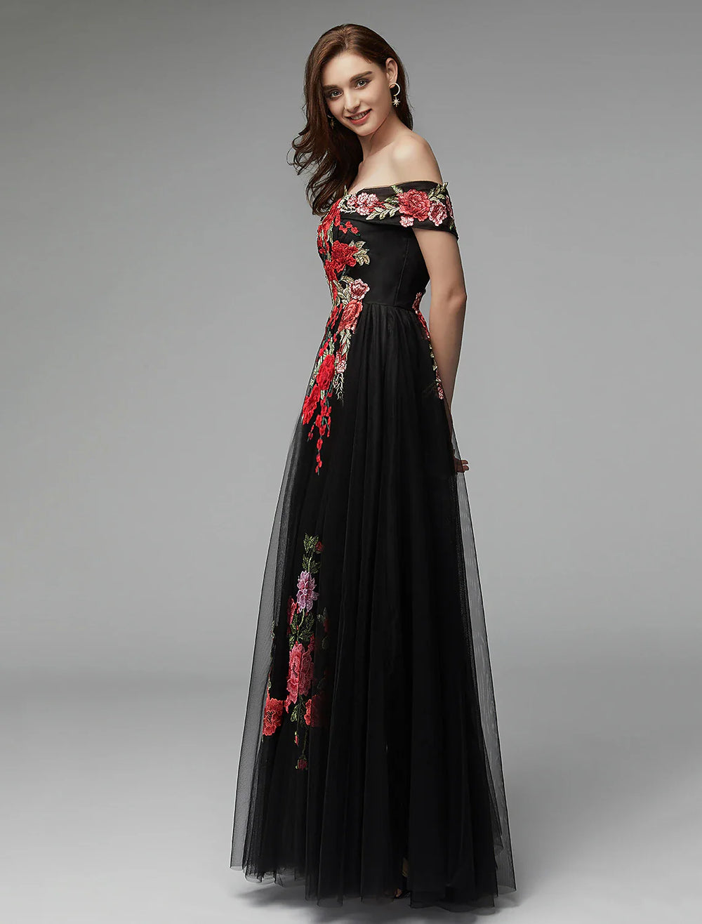 A-Line Prom Dresses Floral Dress Wedding Guest Prom Floor Length Sleeveless Off Shoulder Lace Over Tulle with Embroidery Appliques