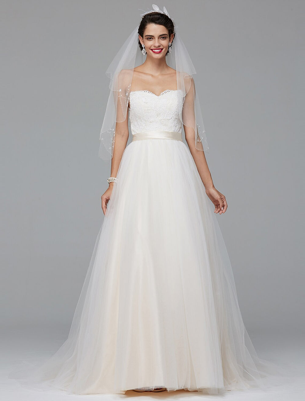 A-Line Wedding Dresses Sweetheart Neckline Court Train Lace Tulle Sleeveless Wedding Dress in Color with Sash / Ribbon Buttons