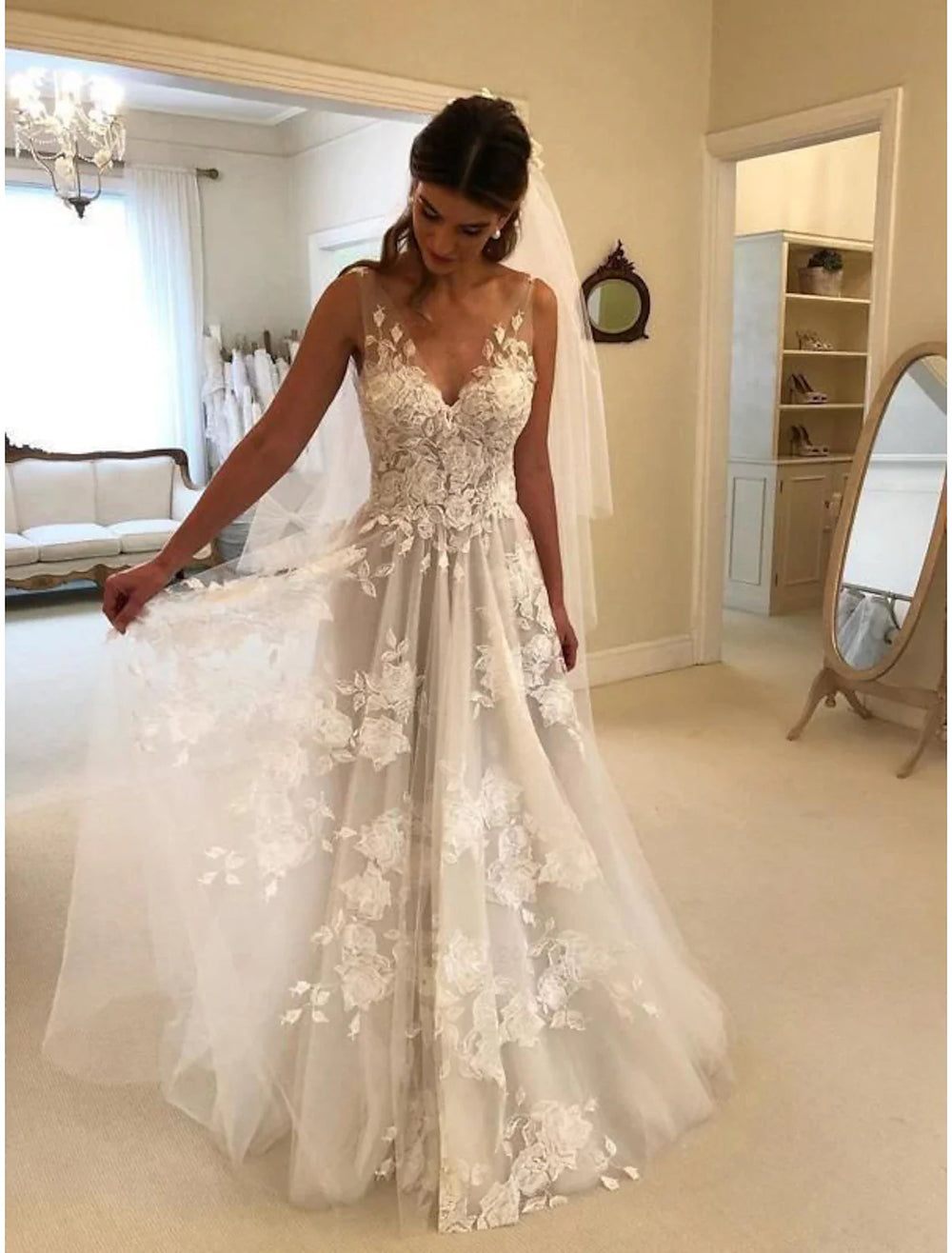 Beach Boho Wedding Dresses A-Line V Neck Sleeveless Sweep / Brush Train Lace Bridal Gowns With Appliques Summer Fall Wedding Party Women‘s Clothing