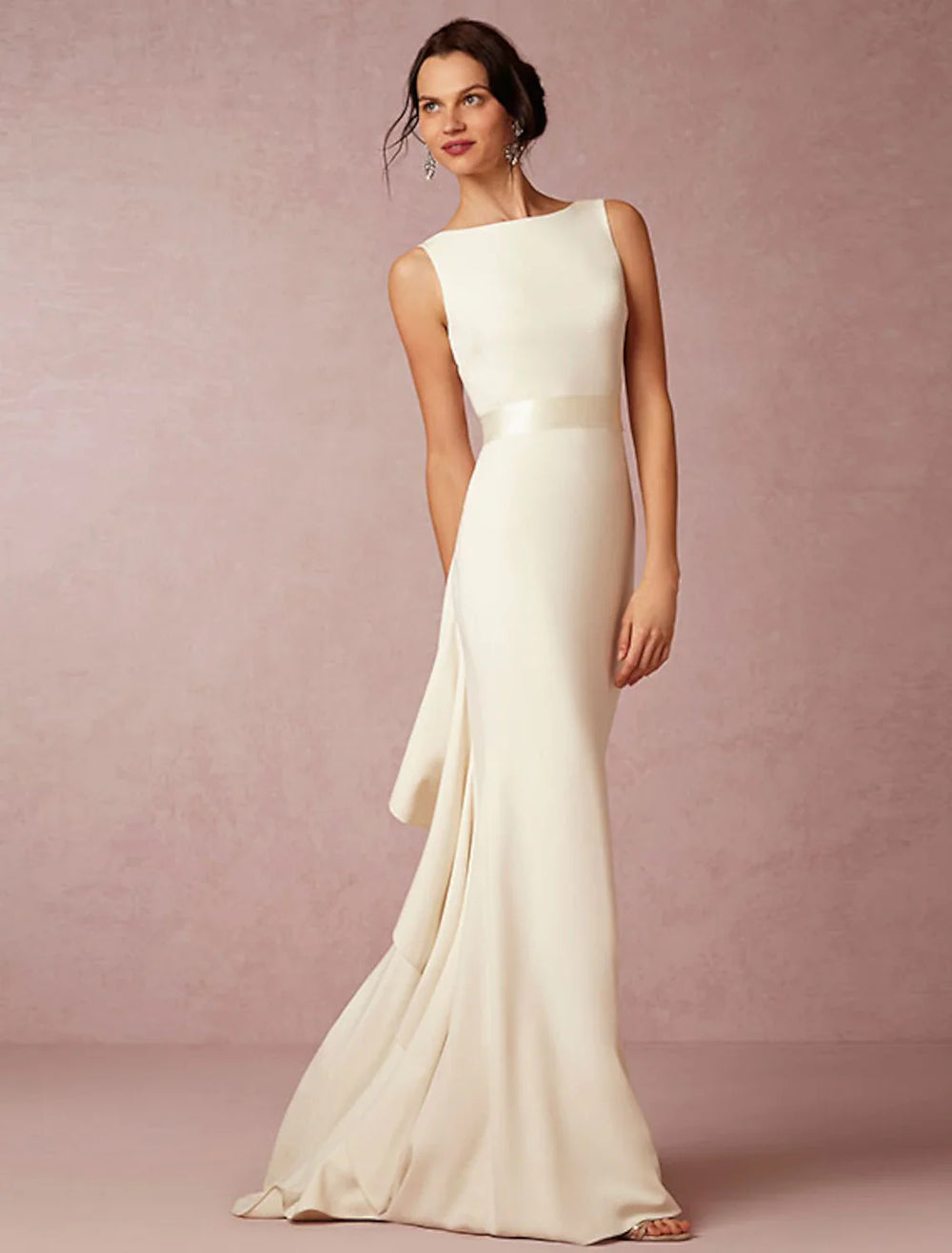 Hall Open Back Casual Wedding Dresses Sheath / Column Scoop Neck Sleeveless Sweep / Brush Train Fabric Bridal Gowns With Draping Summer Fall Wedding Party Women's Clothing