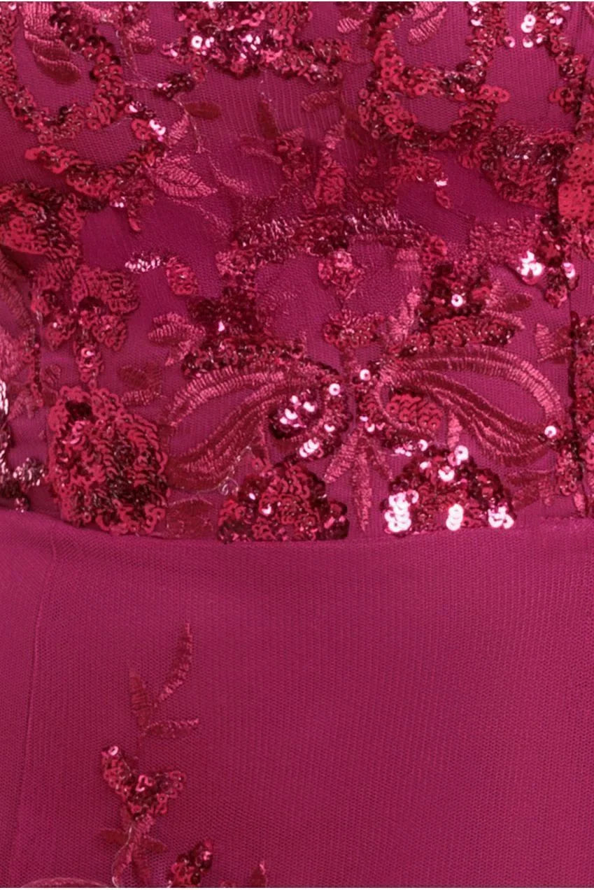 This sleeveless back zip mother dress does not include any accessories shown in the image, such as a cape, jacket, gloves, veil, or handbag.