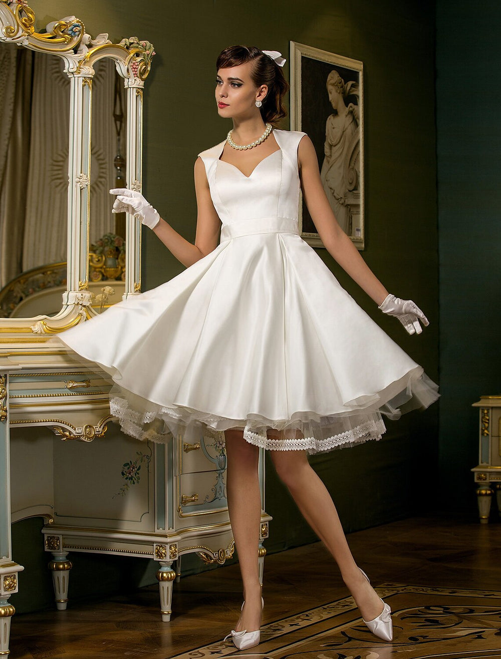 Reception Vintage 1940s / 1950s Little White Dresses Wedding Dresses A-Line Sweetheart Cap Sleeve Knee Length Satin Bridal Gowns With Lace Button Summer Wedding Party Women's Clothing