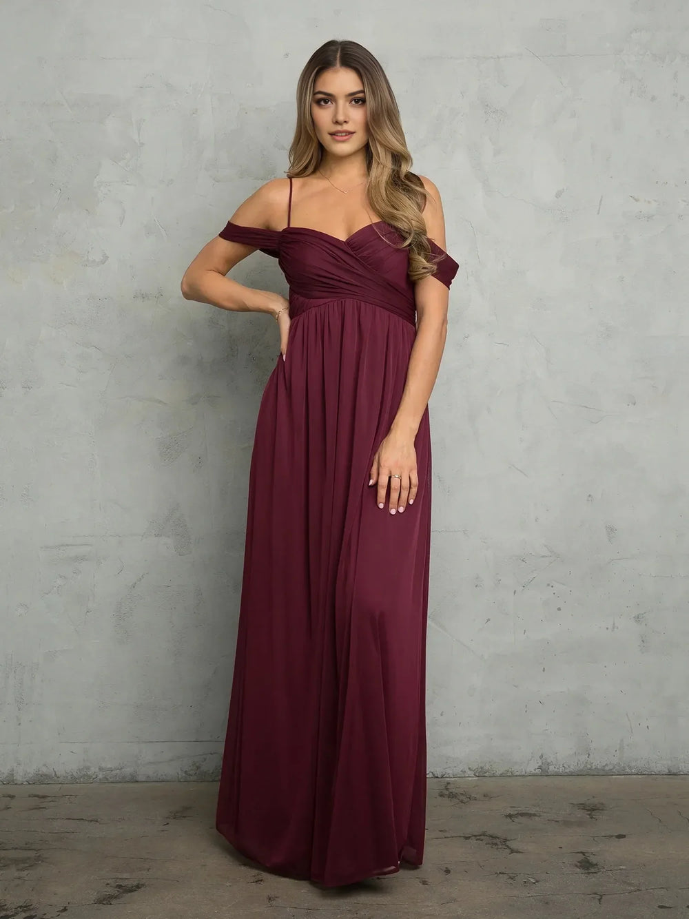 This romantic burgundy prom dress features a flowy A-line silhouette crafted from lightweight chiffon, with an off-shoulder sweetheart neckline and delicate short sleeves. The ruched bodice and zipper-back design offer a flattering fit, while the floor-length skirt creates an elegant, timeless look—perfect for making a soft, memorable entrance at prom.